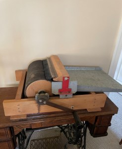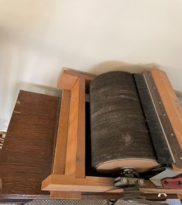 A Fricke drum carder with a strong bike chain runs the gears for a smooth carding experience. The frame is sturdy and the carder has been limited used. The drum is for fine wool, like Alpaca or Angora.