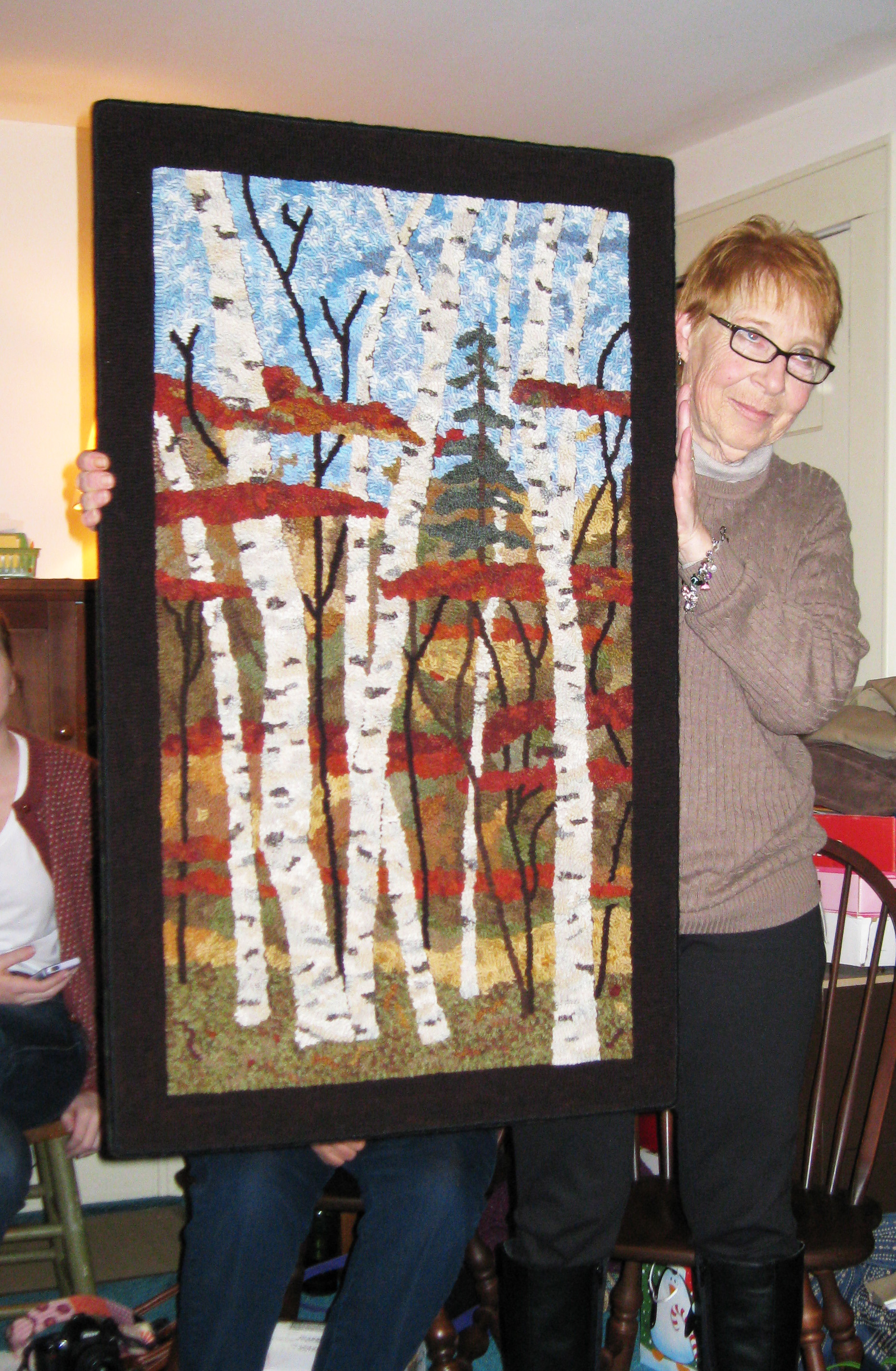 Jan and hooked pict ← Previous Next → Jan wowed us all with her beautiful hooked picture of the view from the window of her former house in Minnesota.