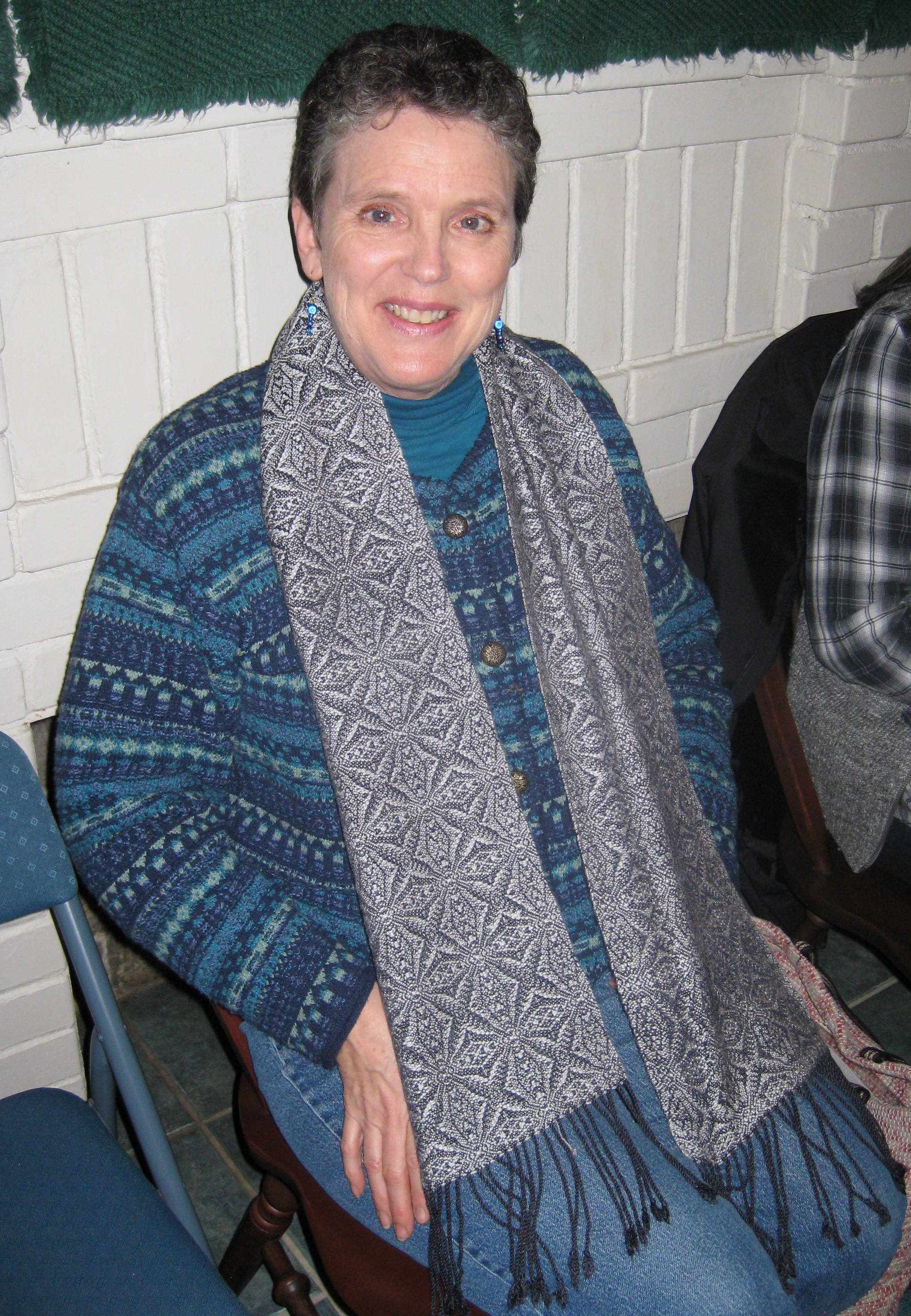 Kathy with silk scarf ← Previous Next → Kathy wove a silk scarf in “Snowflake” design, reminiscent of the snowy roads she encounters in N. Dakota