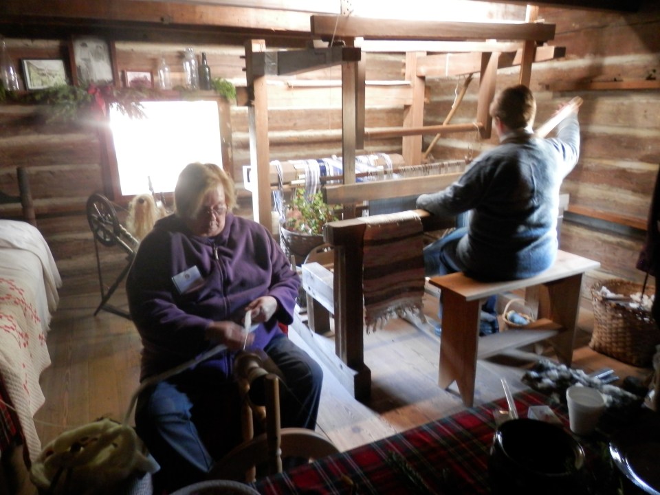 Nancy spinning and Kate weaving