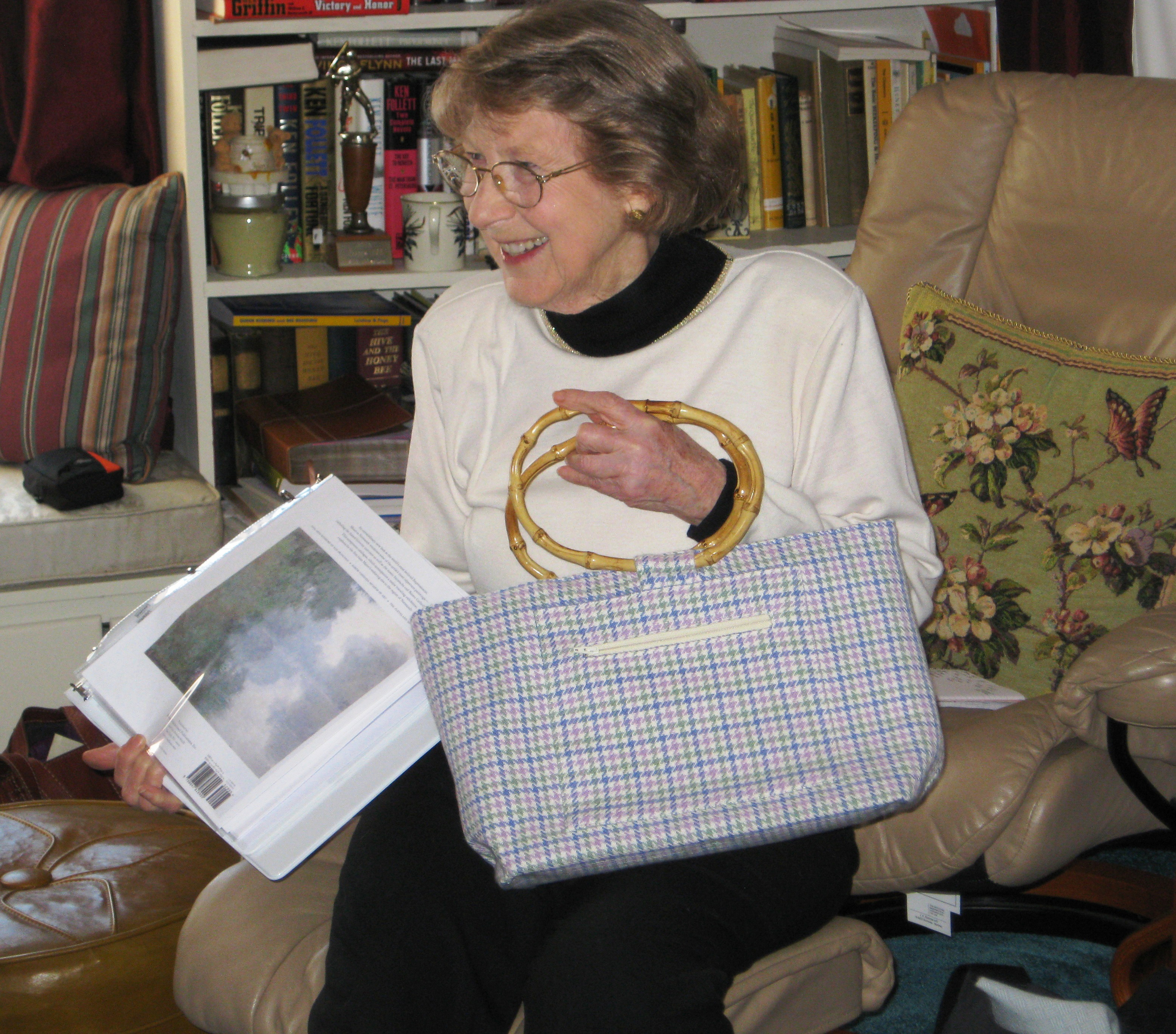 Jacque and Monet ← Previous Next → Jacque drew her inspiration from Monet’s “Morning Mist” on the Seine and wove the fabric for a knitting bag.