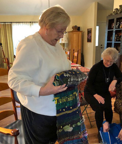 Nancy with wall hanging fixed ← Previous Next → Nancy wove two spectacular wall hangings and embellished them with her life’s story. The first was decorated with her family’s history through her college days and the second was full of her memories since then. Like Loading...