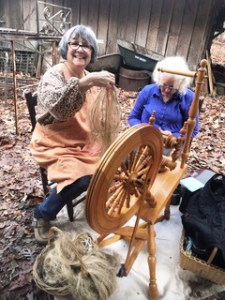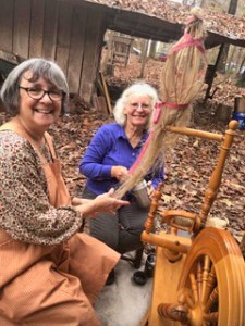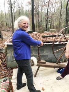 And then there were old friends who came by to visit and volunteer for a while. Nancy came to knit but also helped out the Randolph County Quilters Guild demonstrate on a large quilting frame. As Linda explained there were more old friends to be remembered because much of the equipment in use that day had been donated by the families of guild members no longer with us. Linda and Cindy demonstrated warping a rigid heddle loom–it had been Nancy’s, and Jackie spun flax on Barbara’s Canadian spinning wheel. She had fond memories of friends departed that had been embedded deep in their equipment.