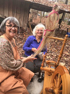 Jackie and Laura spinning flax